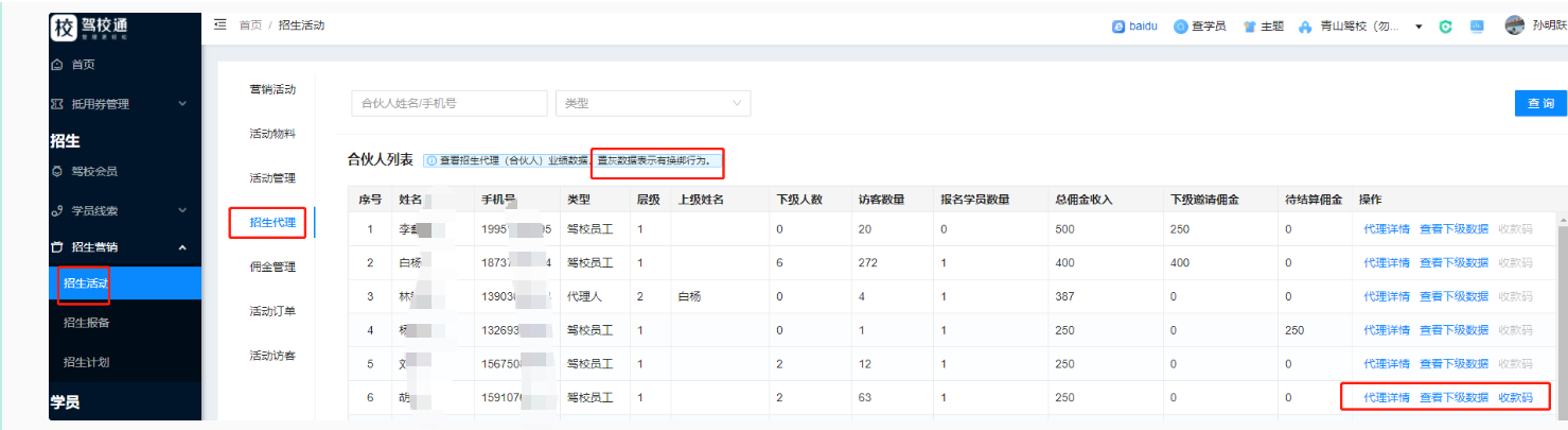 成为合伙人后,在招生活动-招生代理的栏目里,可以看到合伙人的信息及下级数据,同时可以设置收款码,进行佣金发放。