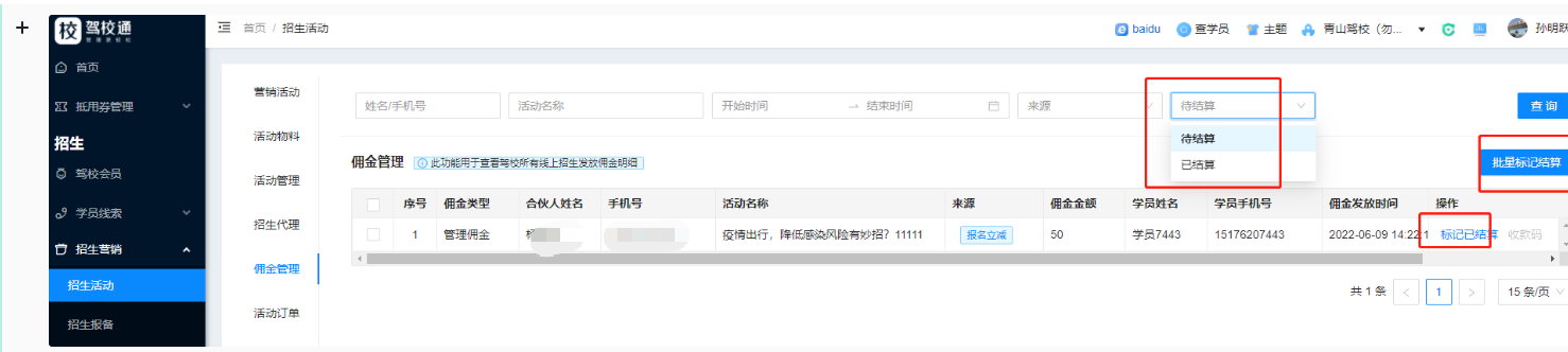 合伙人招生后,会按照活动设置的佣金发放规则,生成佣金记录,显示到佣金管理菜单中。通过收款码支付后可标记已结算,避免重复发放佣金的情况。