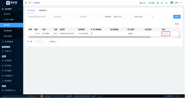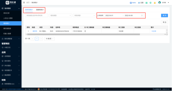 培训统计(按教练或者学员统计扫码练⻋数据,⽤于分析教练实际带训时⻓以及学员练⻋时⻓)可以查询,也可以点击右上角导出。