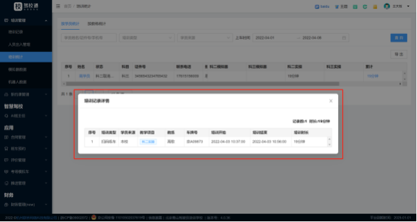 如需查看学员详细的练⻋记录或教练详细的培训学员明细,可点击数据表【累计】这列下的数据,即可弹出培训记录详情弹窗。