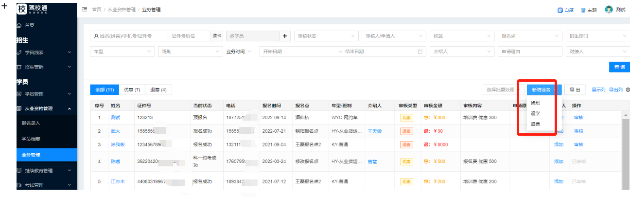 业务管理,主要是对学员的换班、退费、退学的管理操作及优惠或者退费的审核