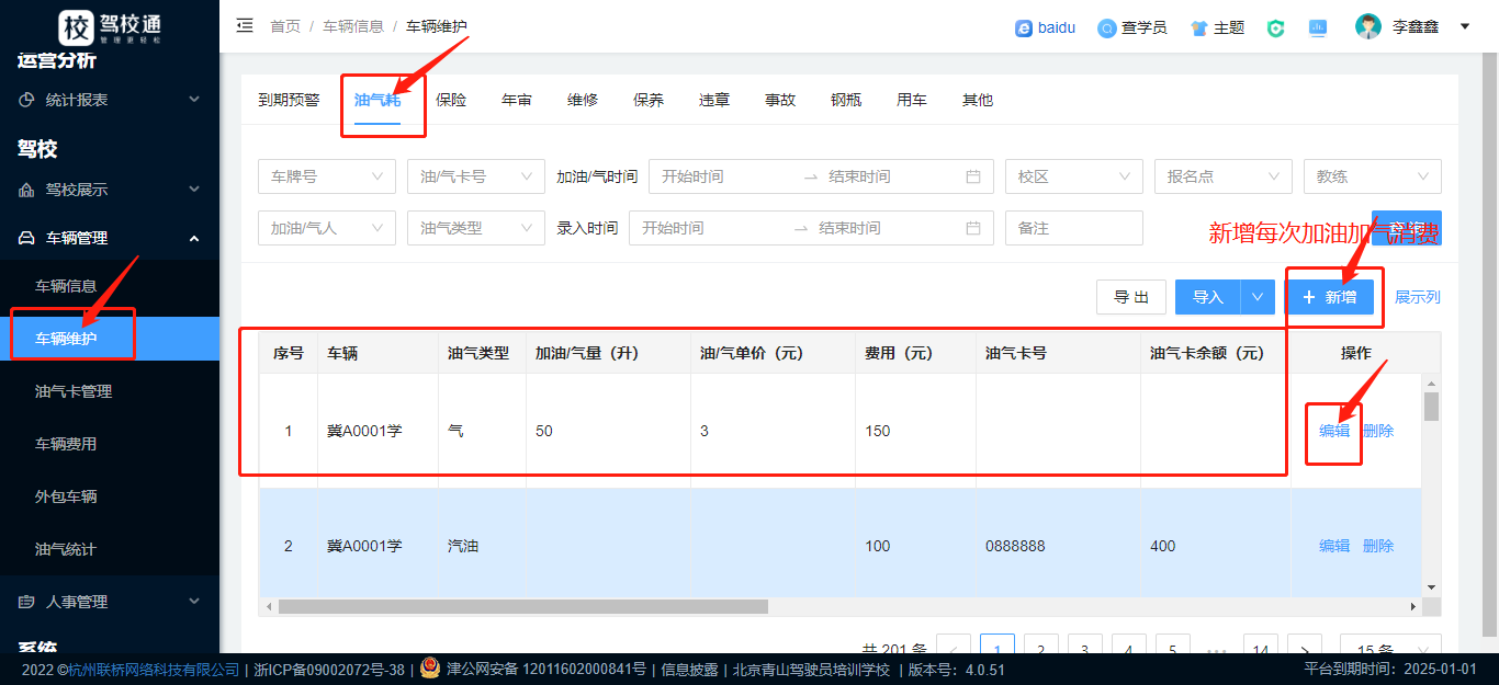 11.车辆维护-其他:车辆维护信息里除了油气耗、年审、保养(系统里已有的字段)之外的项目 ,目前系统里有的维护项目不能满足驾校填写记录的 可以再其他里记录车辆信息 款项费用等相关信息