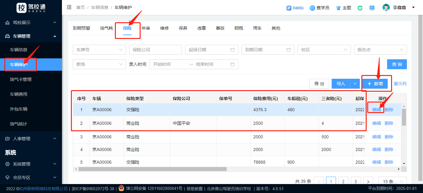 3.车辆维护-保险:对车辆的保险时间进行预警提示提醒驾校相关工作人员进行维护,也可以对每次的维护及费用进行记录。
