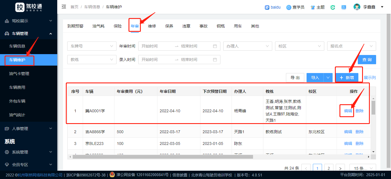 4.车辆维护-年审:对车辆的年审时间进行预警提示提醒驾校相关工作人员进行维护,也可以对每次的维护及费用进行记录。