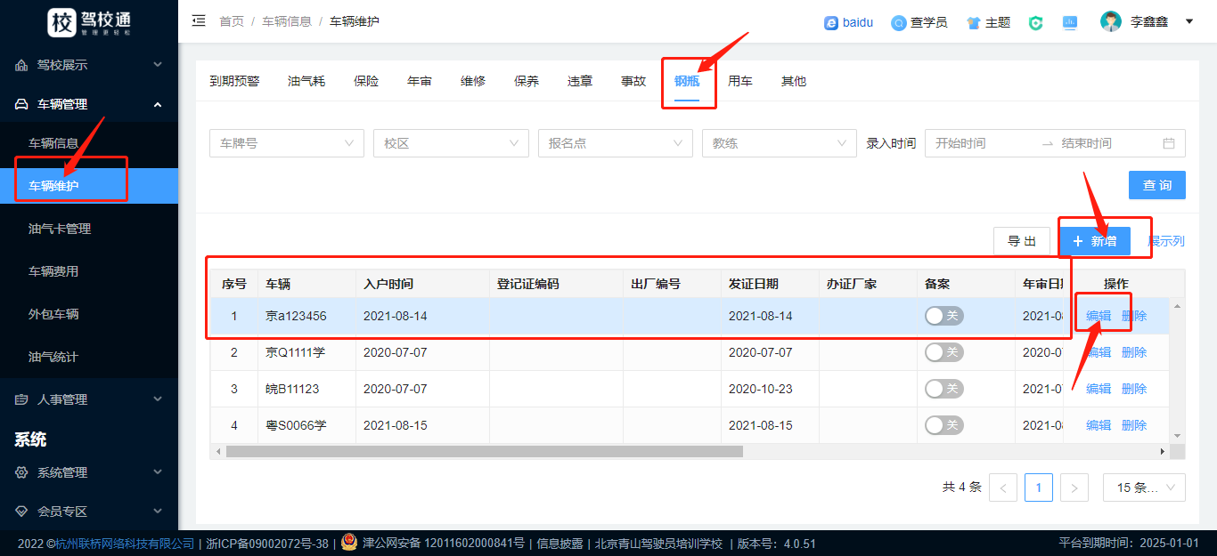 9.车辆维护-钢瓶:对车辆的钢瓶时间进行预警提示提醒驾校相关工作人员进行维护,也可以对每次的维护及费用进行记录。