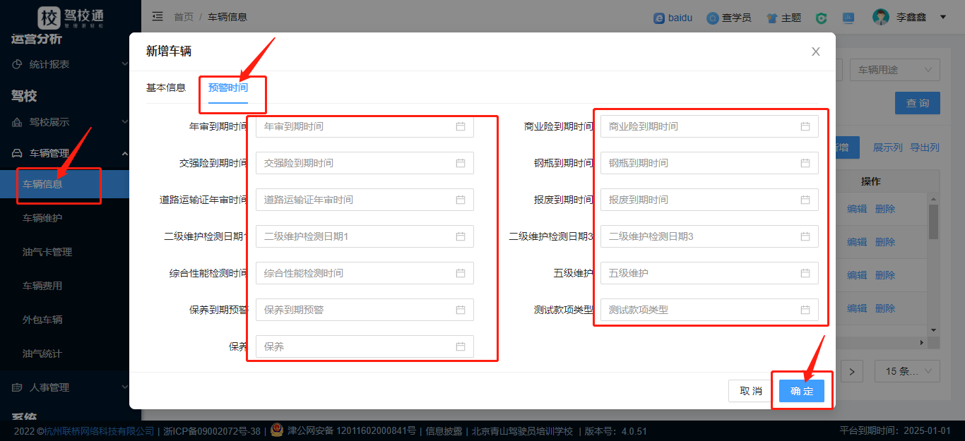 2.新增-基础信息,记录展示驾校详细信息,车辆信息填写的越完善越好。