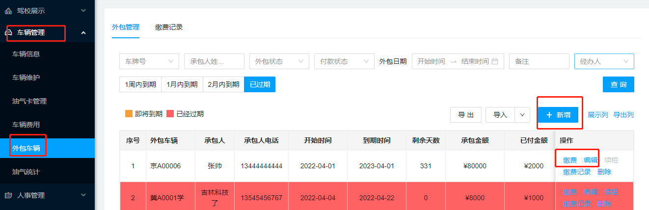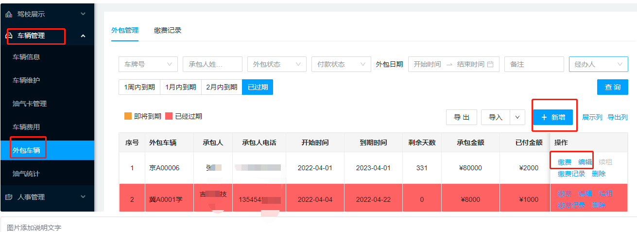 车辆管理-外包车辆,如果有驾校的车辆外包给教练或者其他人,可以记录外包情况