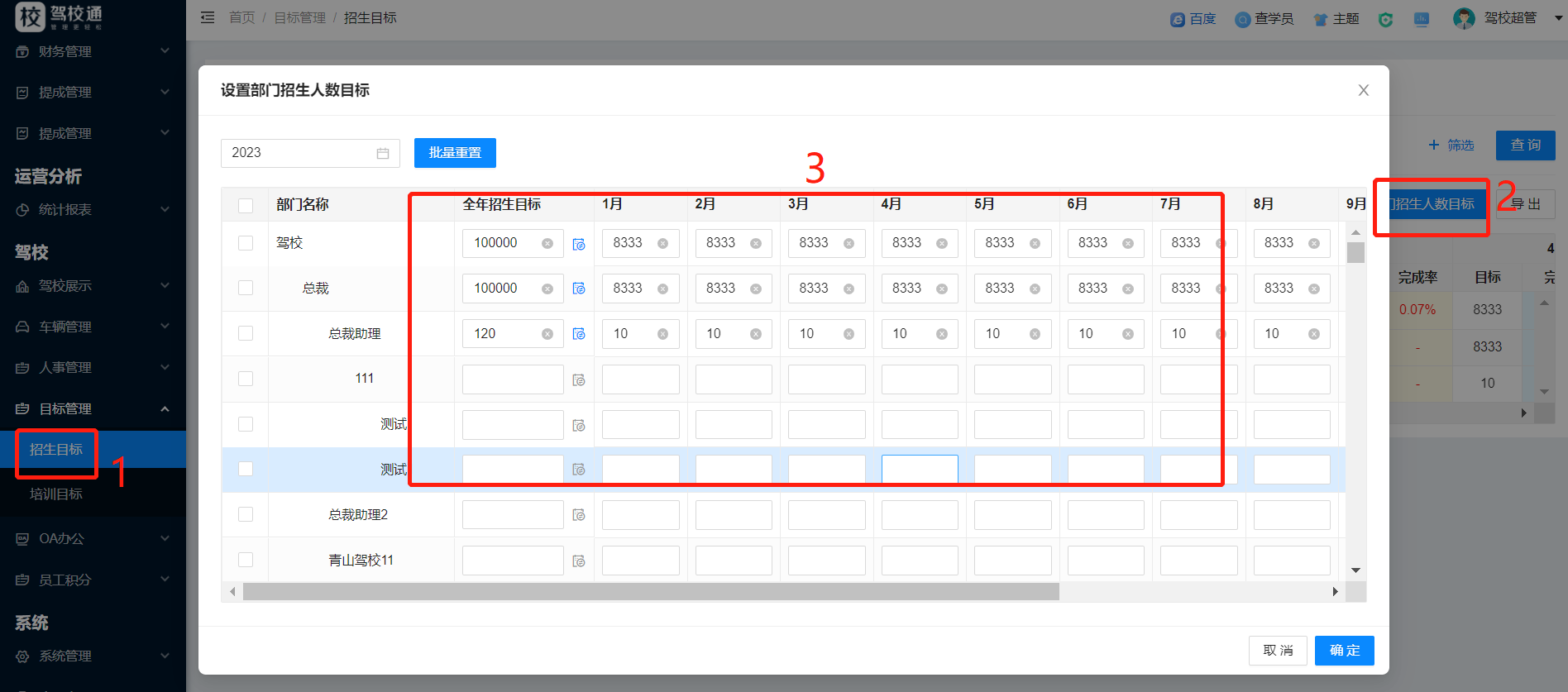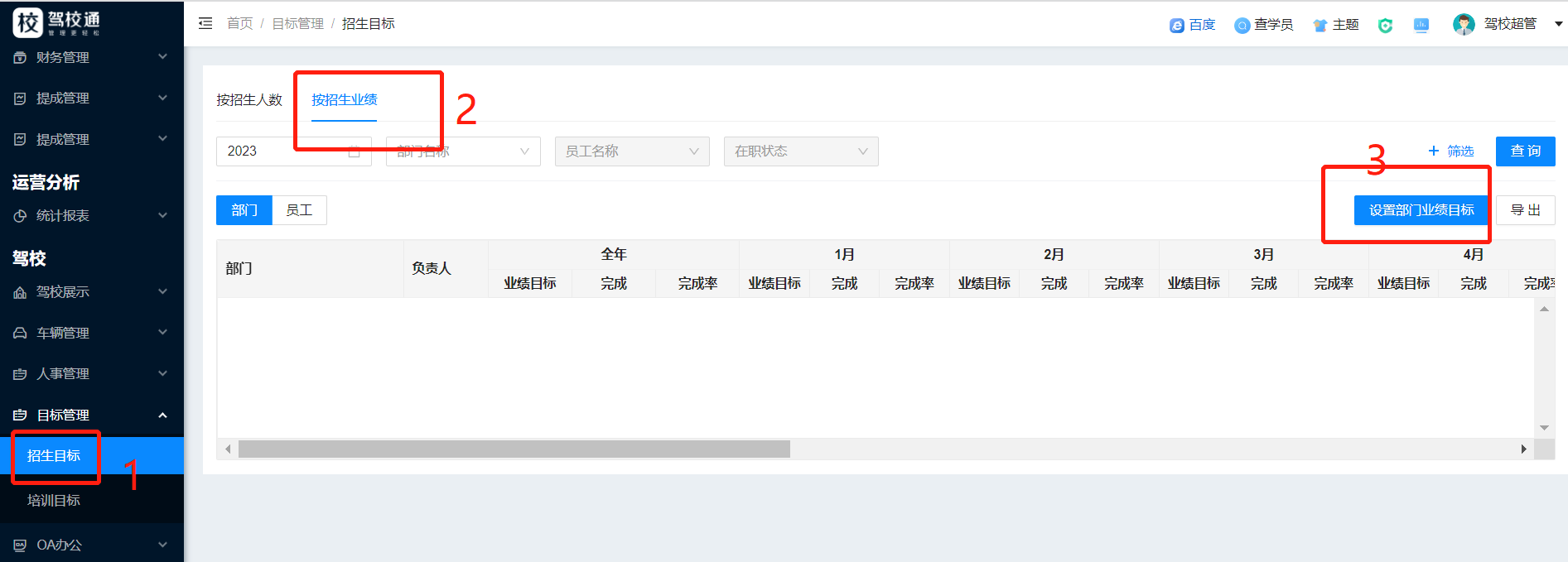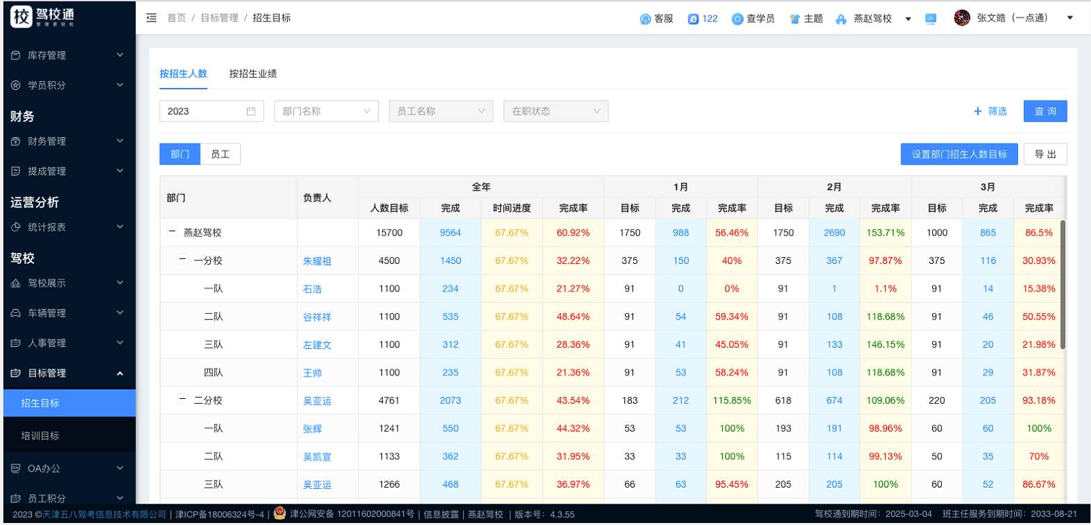 目标管理:驾校可以根据部门或个人定义出全年的【招生的招人目标】和【培训的合格目标】,设置好后可每个月看到对应月份设置的目标完成情况。