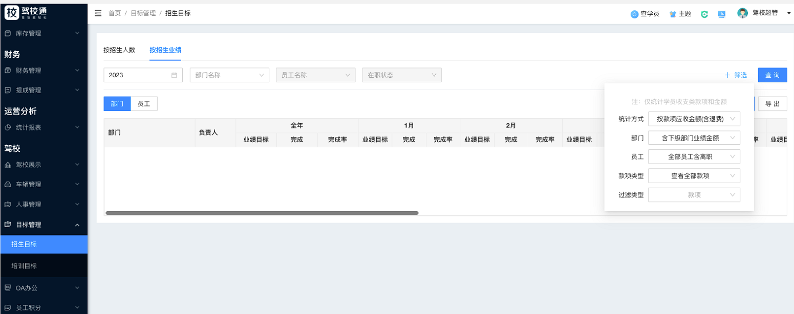 招生(业绩目标):驾校可设置部门或员工个人,定出全年的业绩目标,系统会根据目标金额和已产生的金额进行展示出每个月完成情况等;