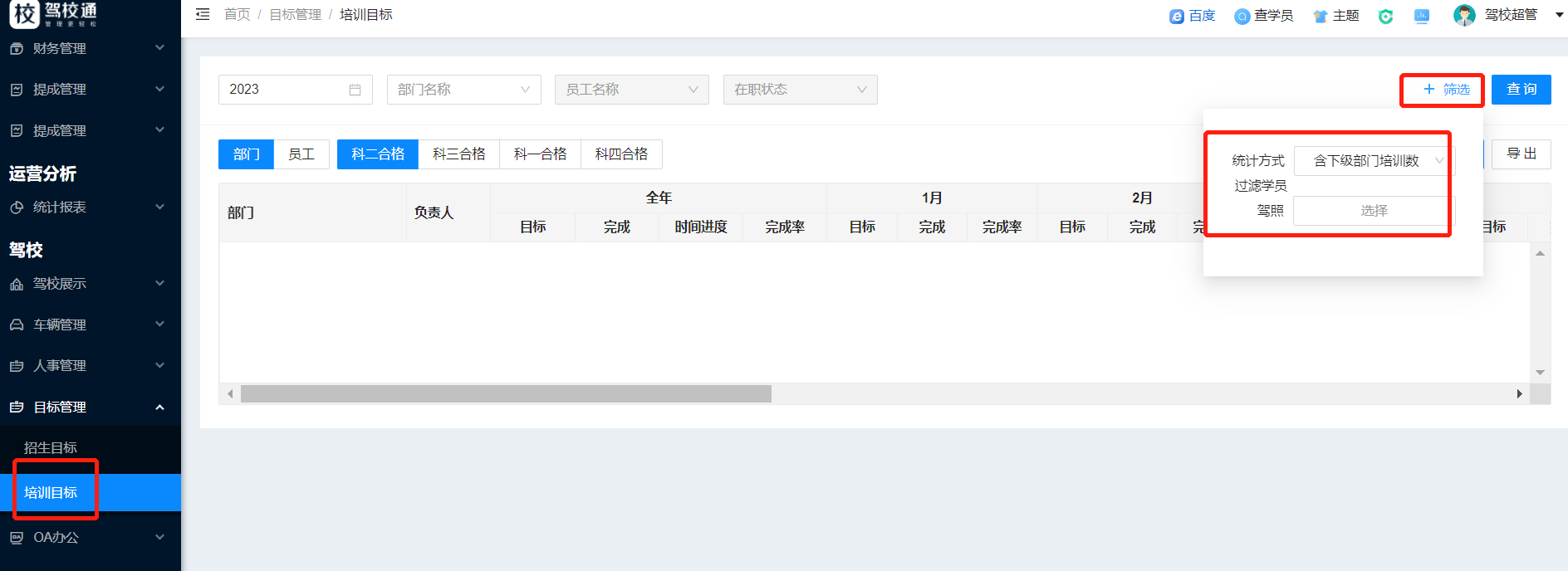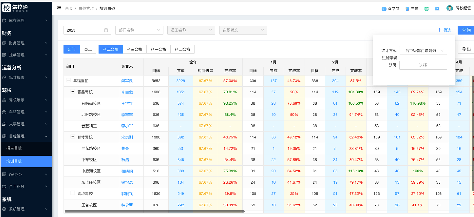 培训目标:驾校可设置部门或员工个人,定出全年的培训合格目标,系统会根据目标数和已合格的学员展示算出每个月的目标和完成情况等;