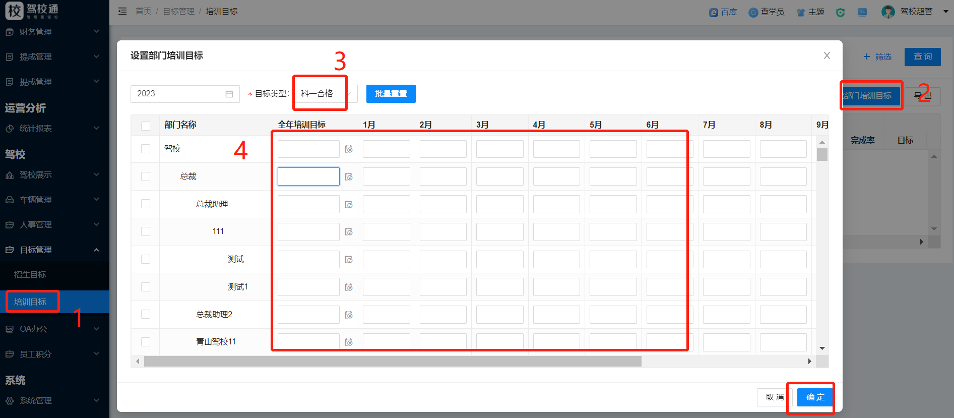 点击“设置部门培训目标“按钮,然后选择目标类型,根据驾校情况设置目标并确定。