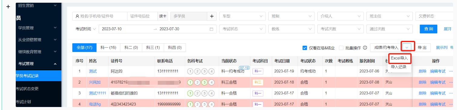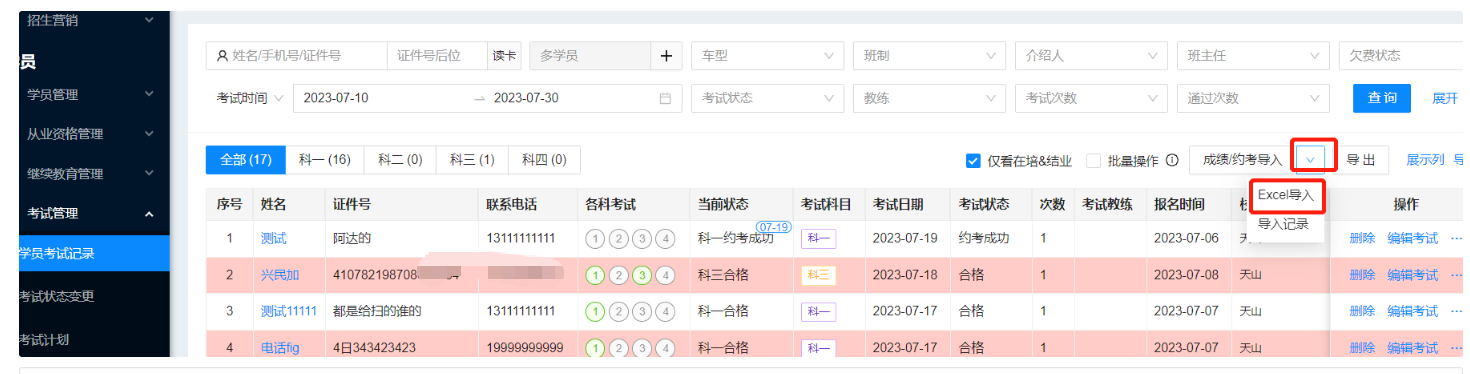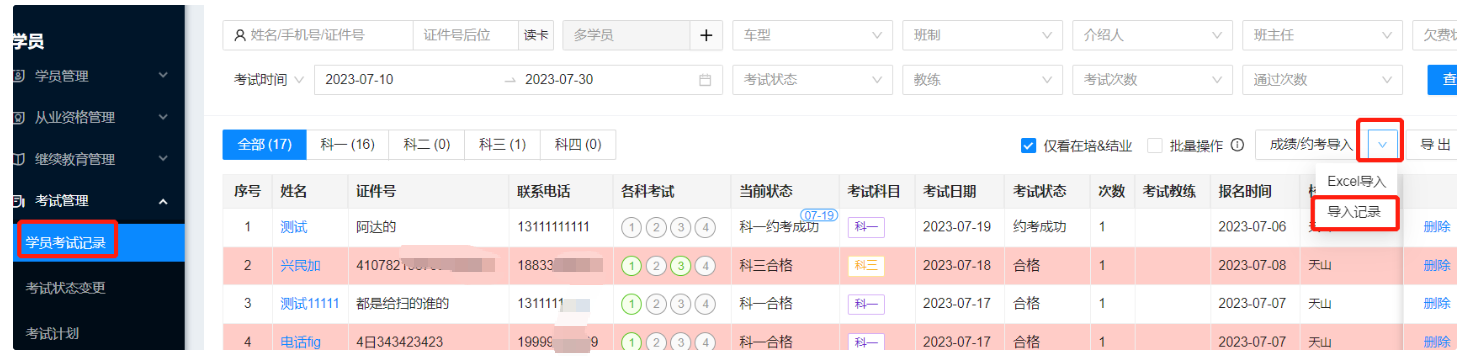 - 通过驾校通系统--考试管理--学员考试记录--点击【成绩/约考导入】旁边小三角,选择“导入记录”