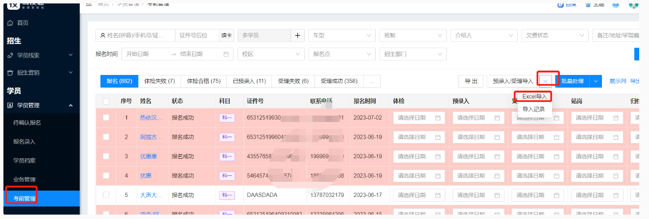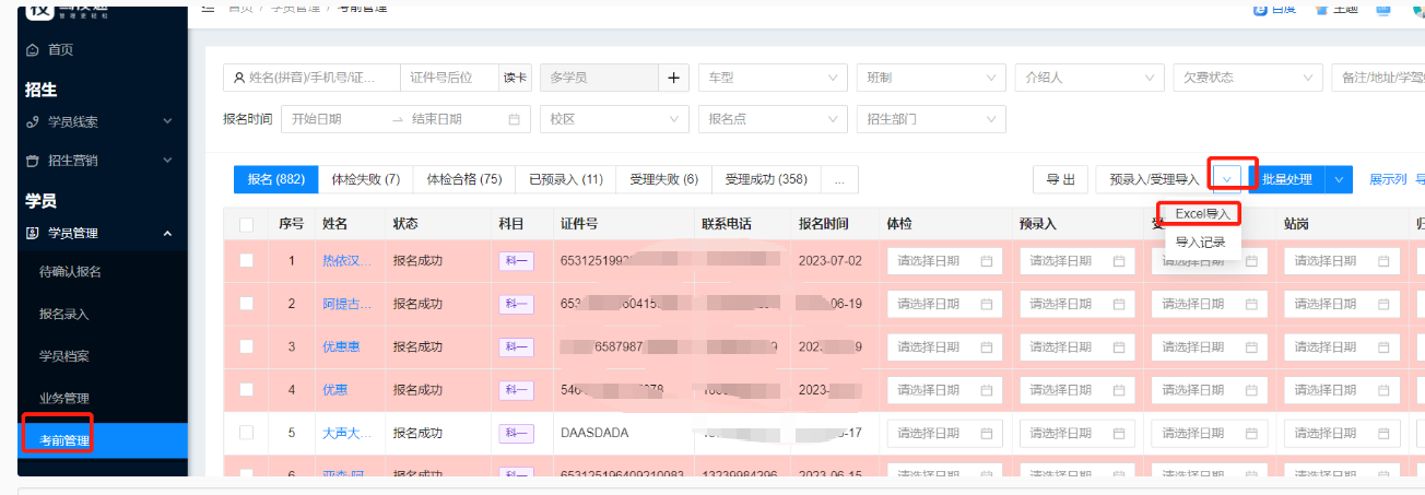 - 通过驾校通系统--学员管理--考前管理--点击【预录入/受理导入】后面的小标志,点击EXCEL导入,进入到我们第一步中,保持不动的页面。