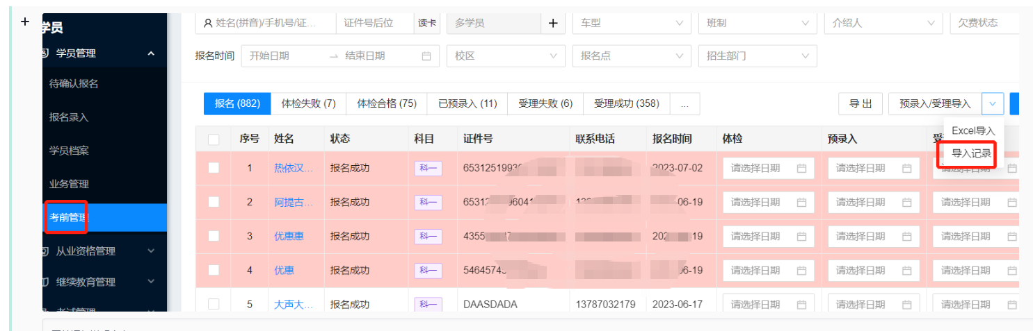 - 查看导入结果,点击考前管理-预录入/受理导入 后面的小符号,选择“导入记录”