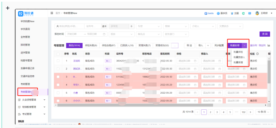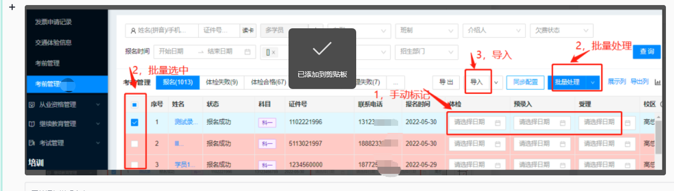 1,考前管理中体检、预录入(面签)、受理有比较精确要求的驾校或者没有U盾的驾校,可以通过考前管理对学员进行手动标记或者批量处理或者导入。