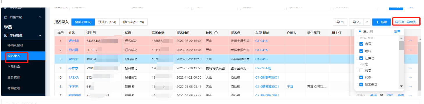 正常使用过程中可以根据驾校自身情况配置展示列和导出列,也可以拖动重新排列顺序