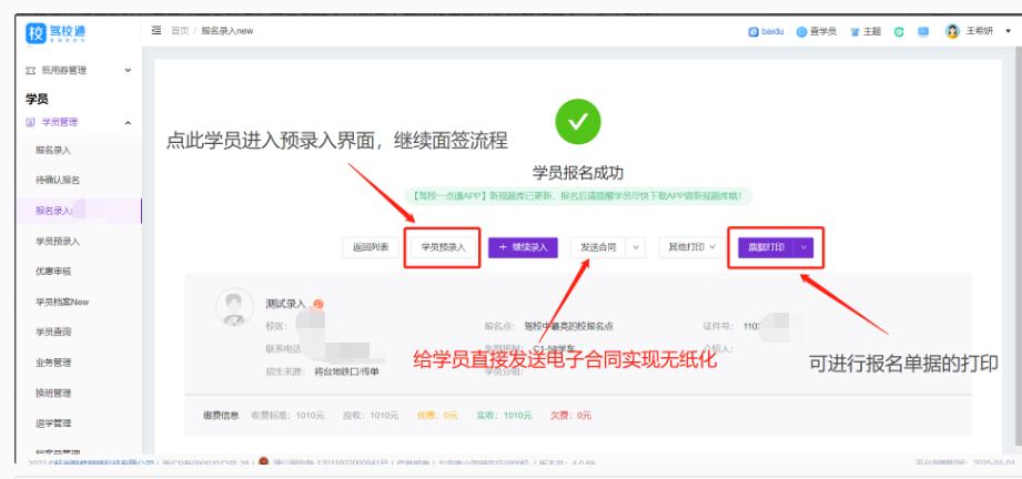 使用管理系统最主要的是录入学员,后续才方便驾校查学员档案、分车等;支持扫码枪收款(操作详情见下方驾付通图文流程)