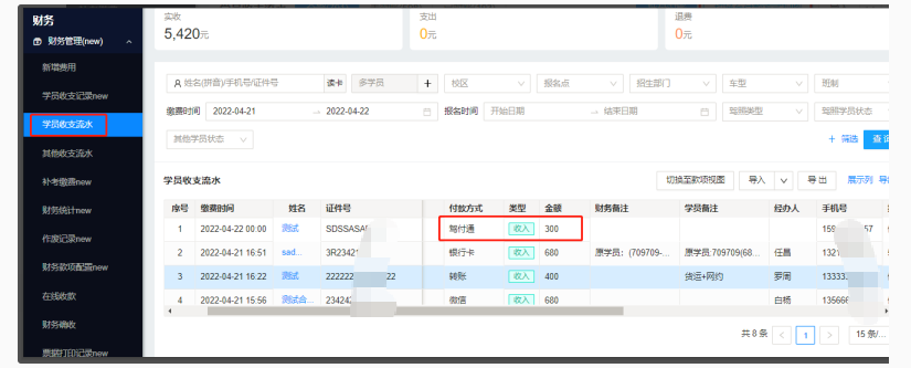 5、通过驾付通支付的费用,无论是扫码枪收款、线上报名支付、扫在线收款码支付,均会在驾校通系统中自动生成一条缴费记录。注意:必须要切换至付款方式视图,才能看到学员缴费列表中有支付方式展现。