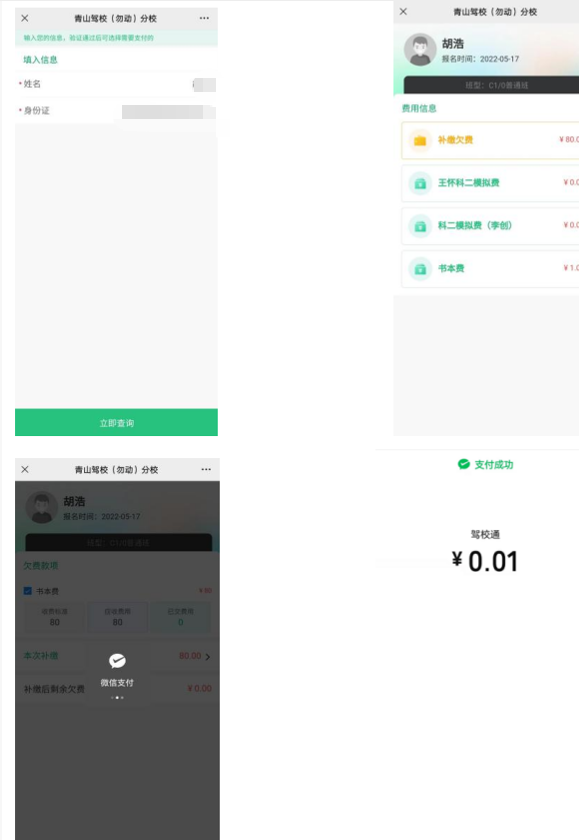 ②学员使用微信扫描二维码并输入自己的姓名和身份证号信息,查阅自己的欠费情况,然后再逐一补缴,最后完成支付;