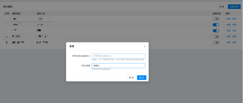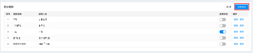 1) 新增/编辑:可配置1条/多条积分规则,适用规则人员教练/非教练/自定义选择的人员不可重复,若某自定义员工符合多个规则,优先取自定义规则,后取教练/非教练规则