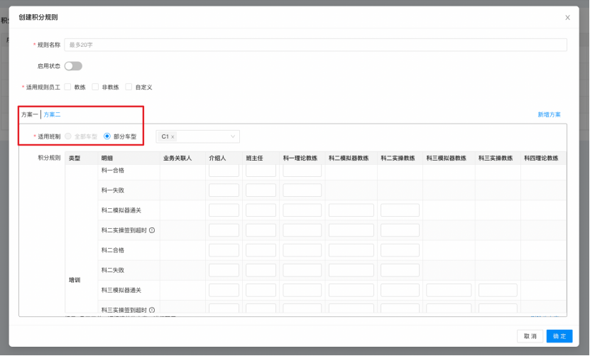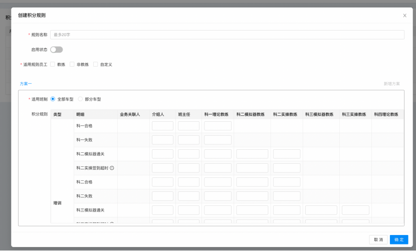 2) 积分规则配置:可根据不同车型配置不同方案,根据积分规则的输入框配置不同类型业务对应积分,加分输入数字例“10”,扣分输入数字例“-5”。