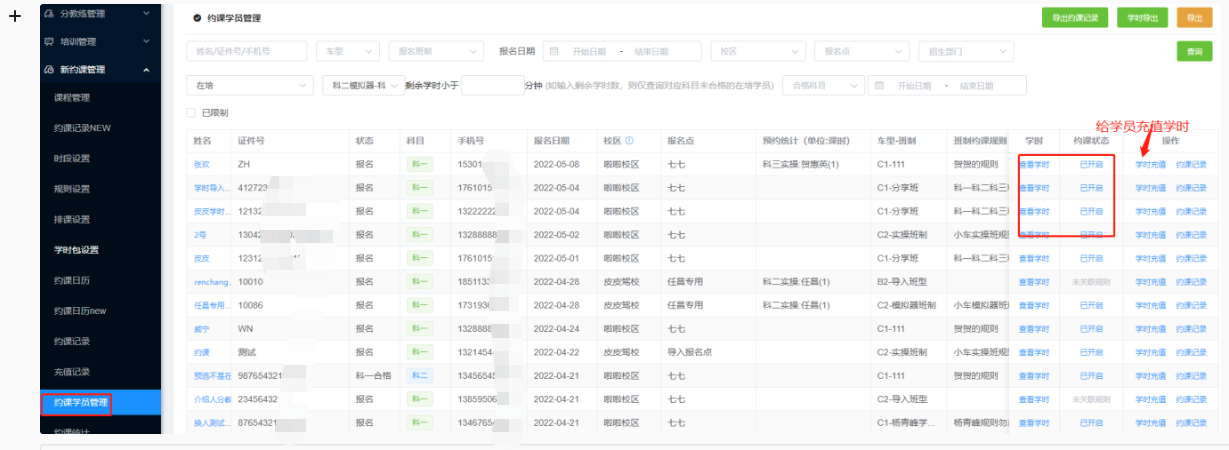 约课学员管理(查询约课学员信息,可通过此界面查看学员学时,约课状态、学时充值等)