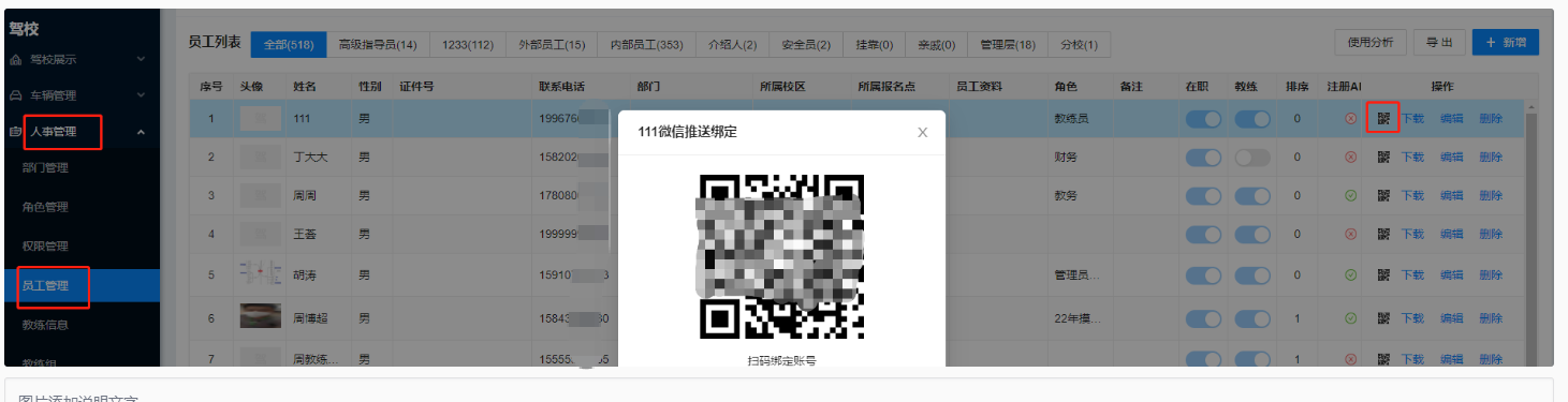 员工可以通过扫描员工信息后面的二维码或者关注“驾校通”公众号点击 帐号绑定,然后就可以收到微信推送了。