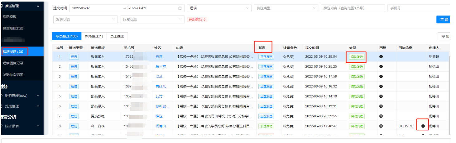 3,推送记录用于查看平台内所有批量发送的短信记录,支持根据发送类发送状态,提交时间等进行短信记录查询。可以查看到是手动发送还是自动发送,回执信息可以查看失败原因等。