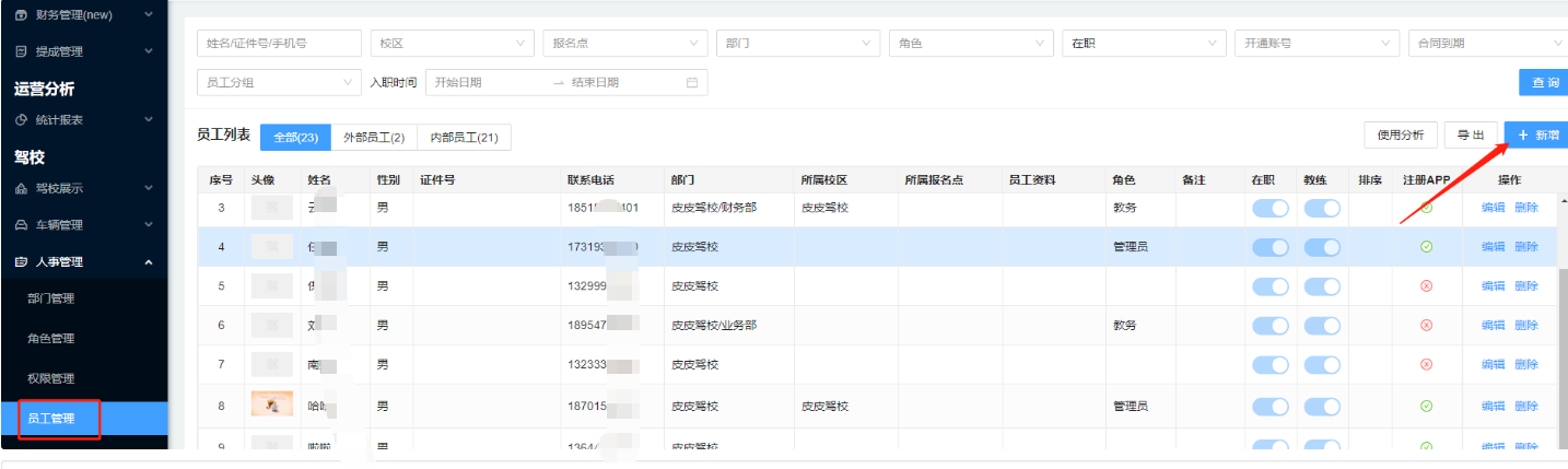 4.员工信息:记录驾校员工数据的界面,可此模块设置驾校对应的角色和权限