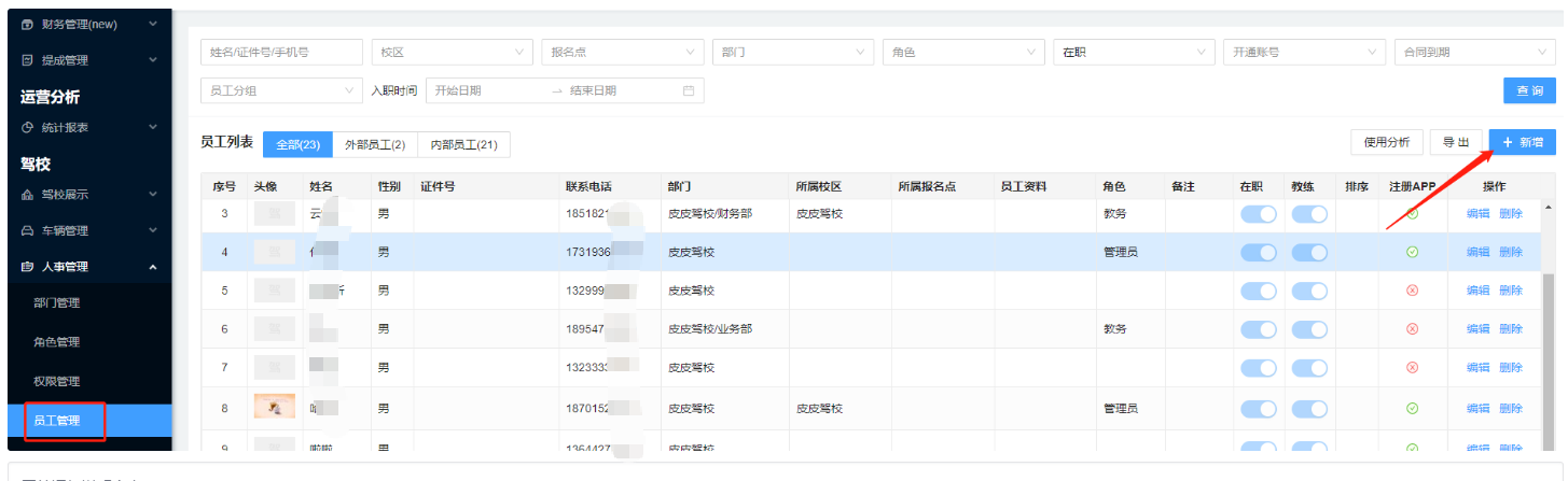 员工信息:记录驾校员工数据的界面,可此模块设置驾校对应的角色和权限