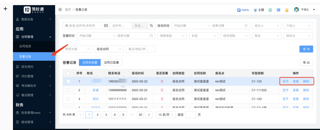 所有已经发送出去的合同信息都会显示在这里,如果学员还未签约,合同可以电脑端签字(需要购买签字板),手机端签字,可查看下载,删除合同。