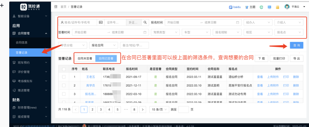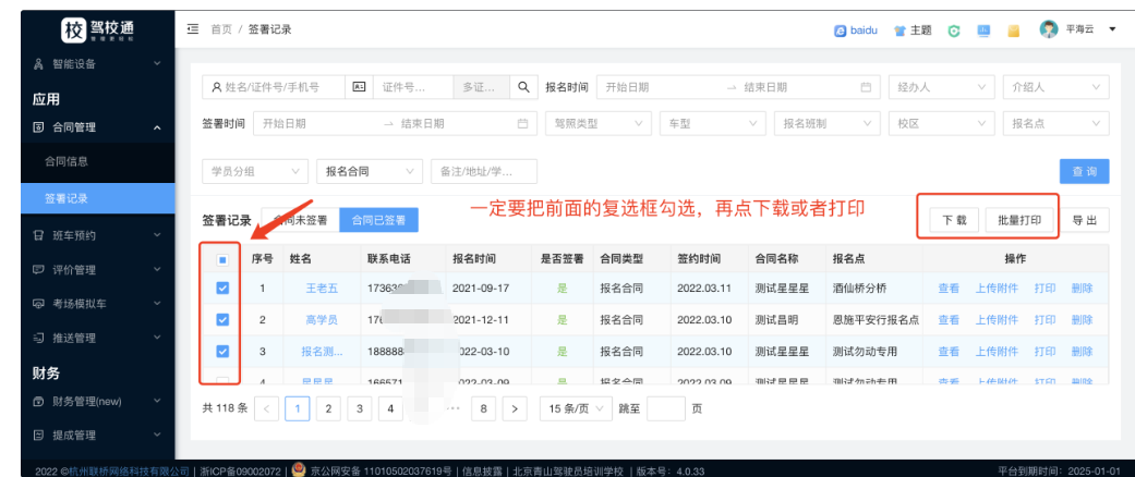 合同已签署界面可以快捷查询到已经签字的学员合同,可以批量下载或者打印。
