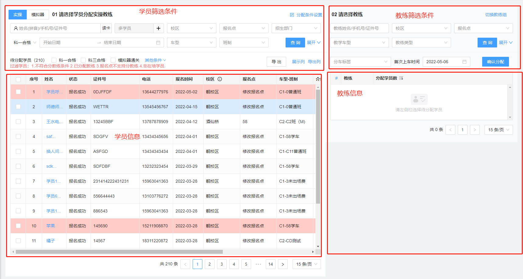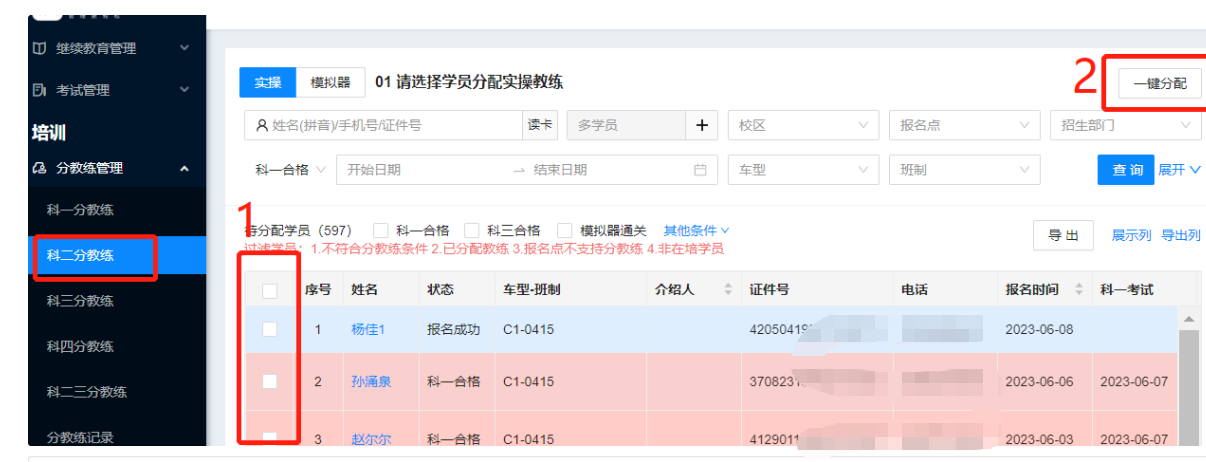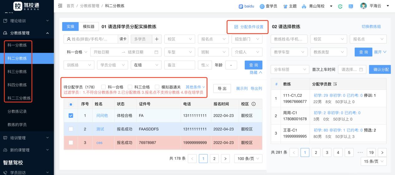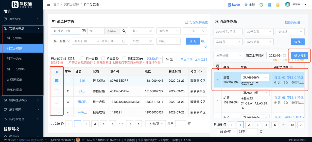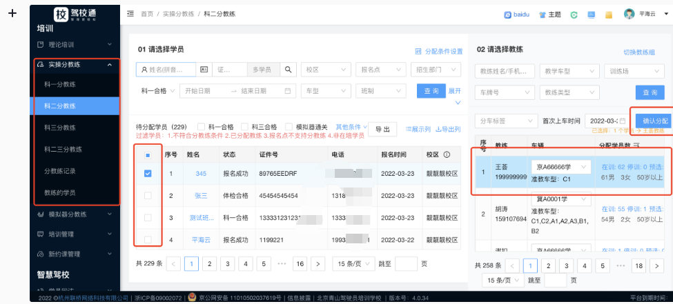 左边选中需要分车的学员,右边待分车教练里会出现可以选择的教练,选中教练点击“确认分配”即可,如图:
