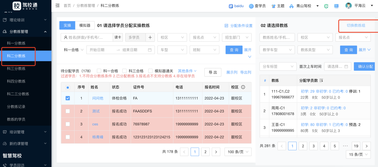 2.如果是以教练组的形式分车,也可以在这里切换教练组。比如有两个教练为一组共同负责学员的科二科三或者科二五项的五个教练一组等。