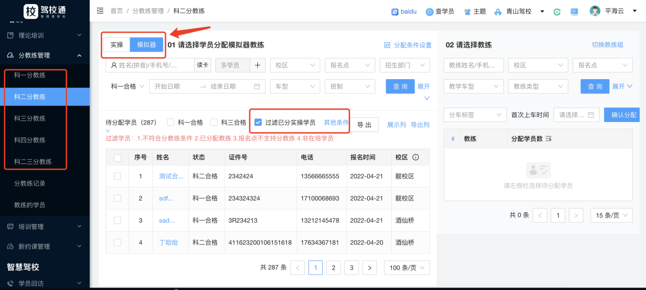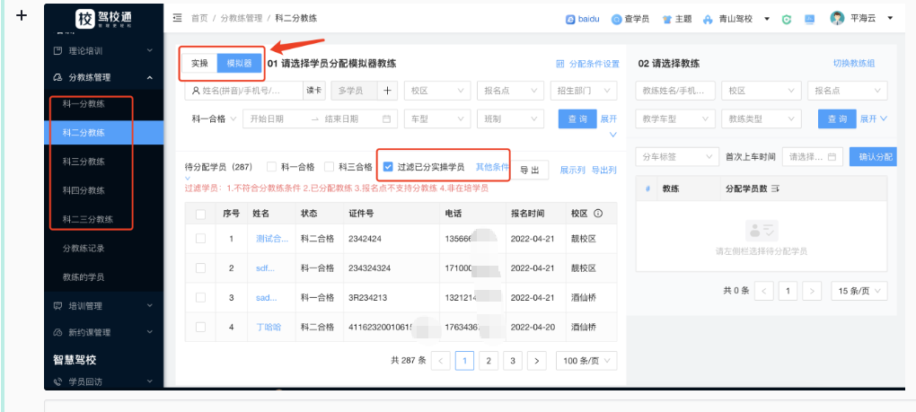 3.模拟器分教练,如果有时用我们模拟器的驾校,还可以分配模拟器的教练。分教练中科一切换实操分教练还是模拟器分教练,如果是给模拟器分教练,还可以设置过滤掉已经实操分教练的学员。如图: