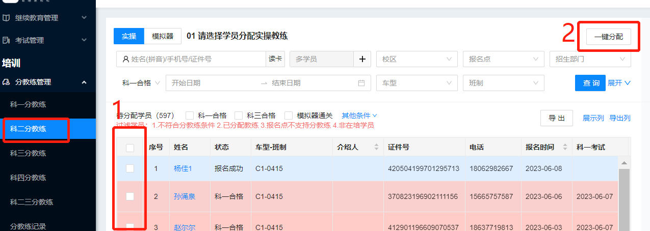 4.一键分配,可以根据条件进行筛选后,勾选对应的学员,进行一键分配。