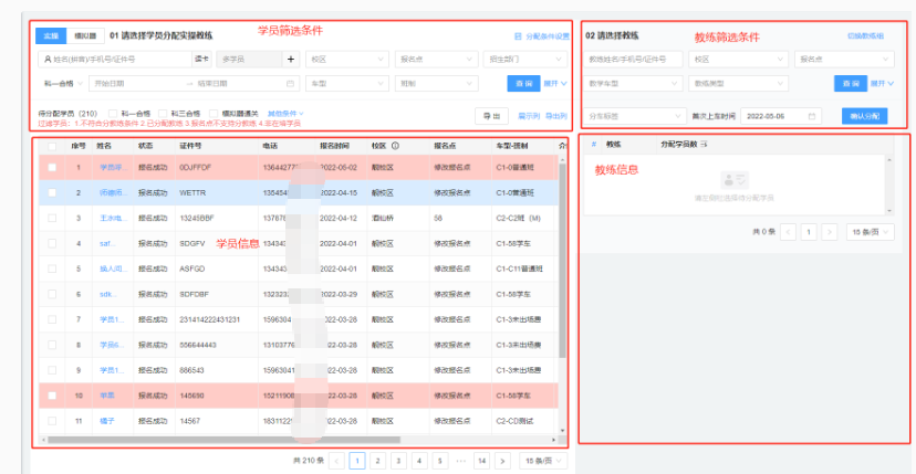 左侧为学员信息展示,分为上半部分学员筛选条件,下半部分学员信息展示