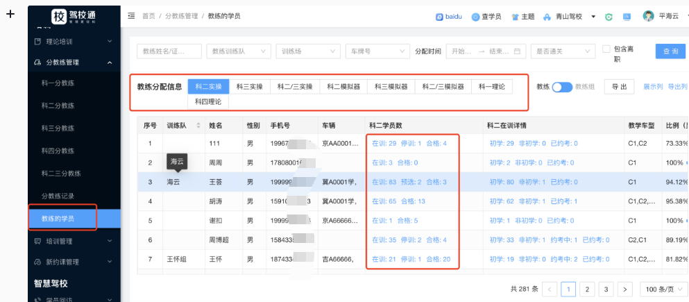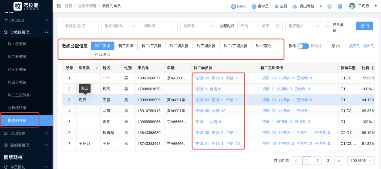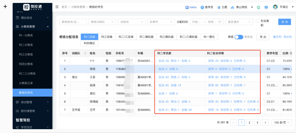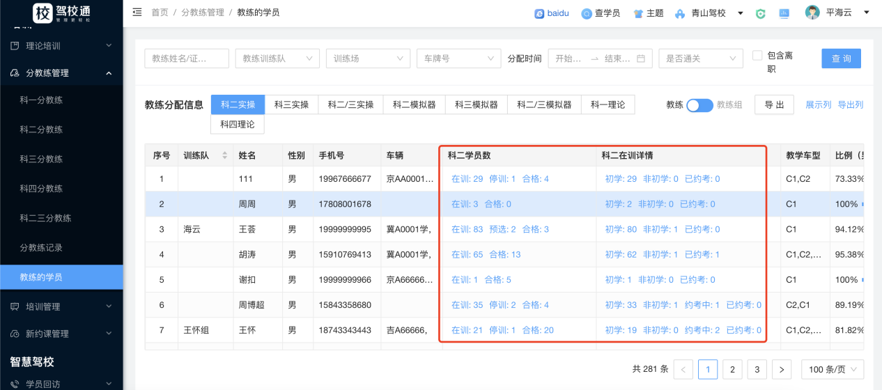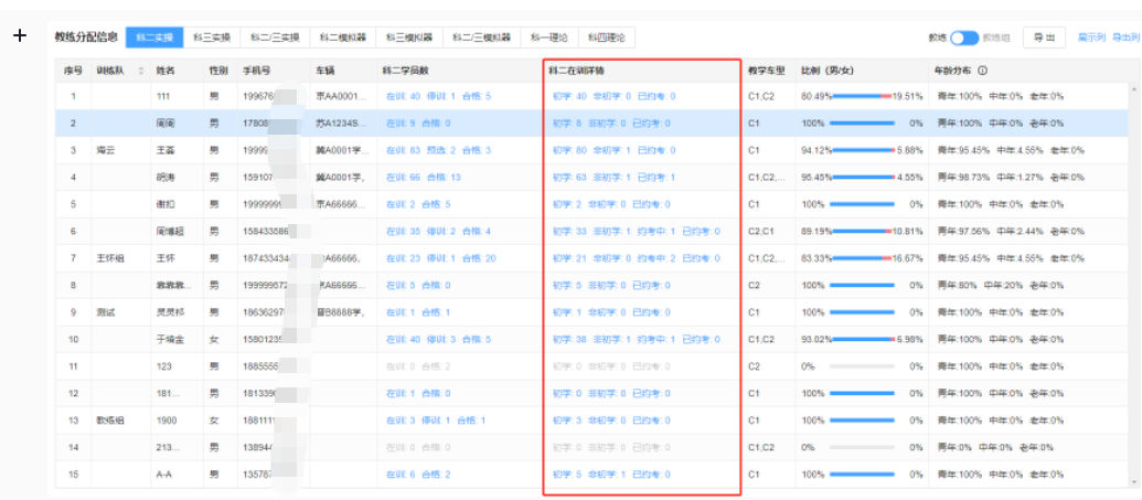 2)其中学员在训详情为驾校管理学员提供了更为详细的学员状态划分,可以清晰直观的查询教练名下学员是否初学以及当前的考试计划上报状态。