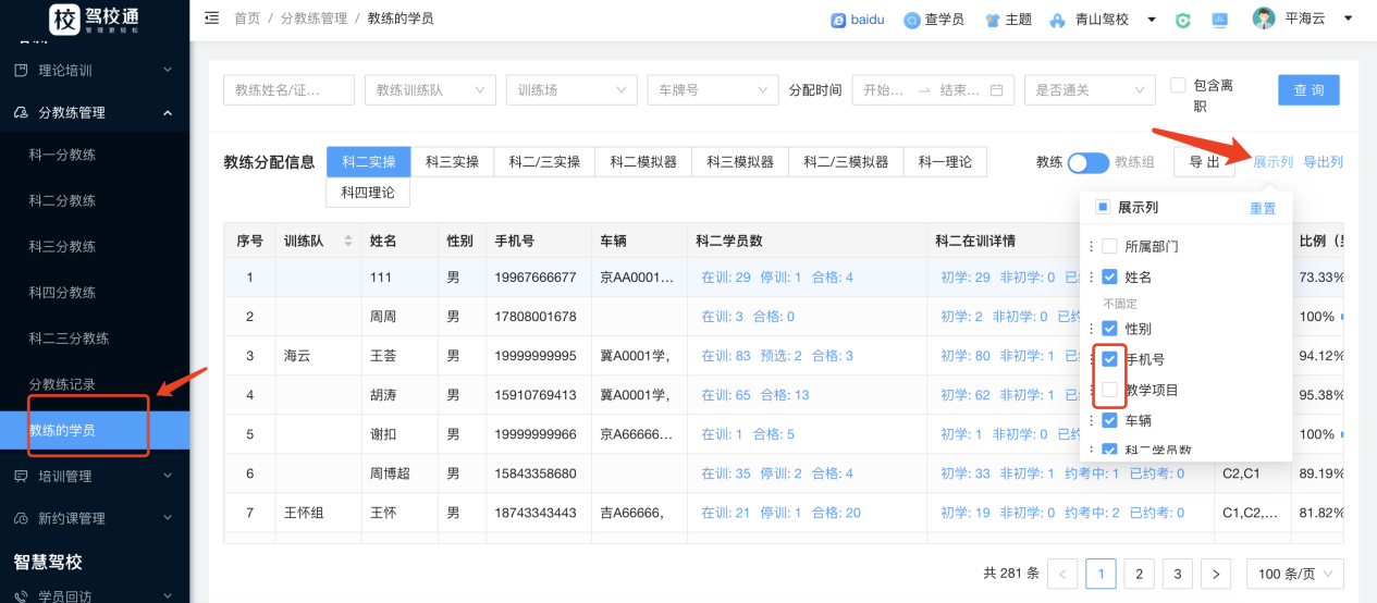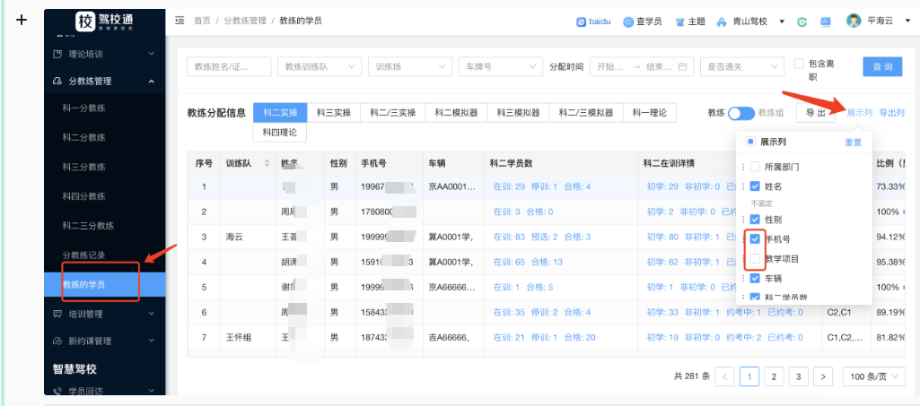1.教练的学员模块儿中可以看到分配到某教练名下学员的信息,展示列、导出列可以设置自己想要展示、导出的字段。
