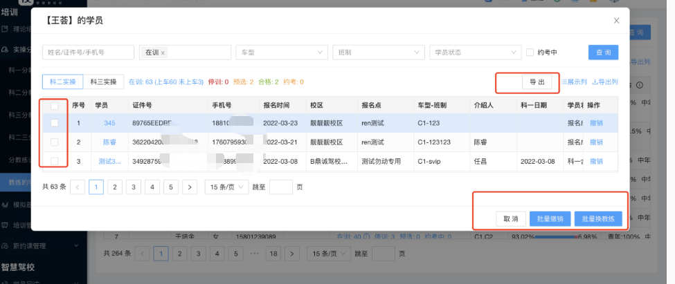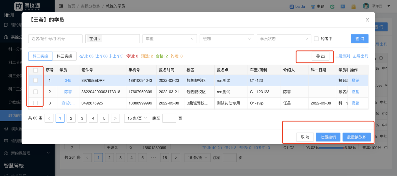 1)点击教练名下学员数字弹出学员详情,可以做批量撤销和换教练的操作。(比如教练离职或请假时间较久,需要批量更换教练的)如图: