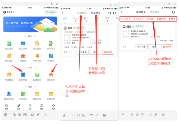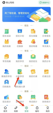 1)登录驾校通app,进入管理页面,点击我的学员或者我的分车,即可查看当前教练名下的学员以及学员状态等信息