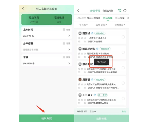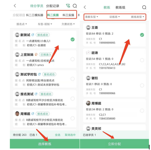 2)选择要分配的学员和科目,选择学员对应的教练,立即分配
