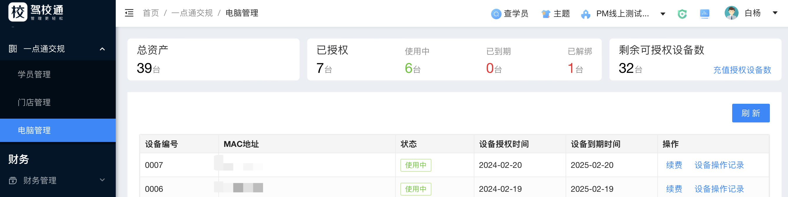 展示驾校授权设备数量及到期时间,到期后可以通过此页面自主续费。