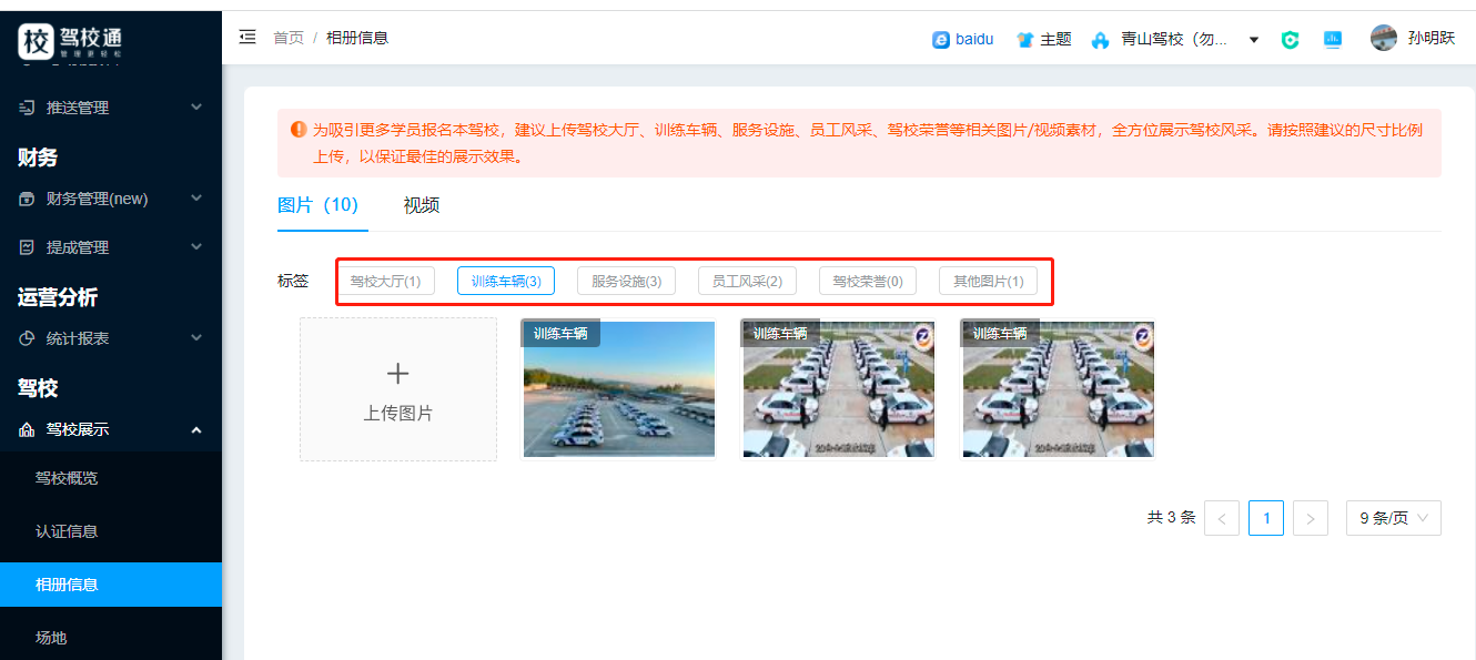 为吸引更多学员报名本驾校,可以上传驾校大厅、训练车辆、服务设施、员工风采、驾校荣誉等相关图片/视频素材,全方位展示驾校风采。特别注意:请按照建议的尺寸比例上传,以保证最佳的展示效果。