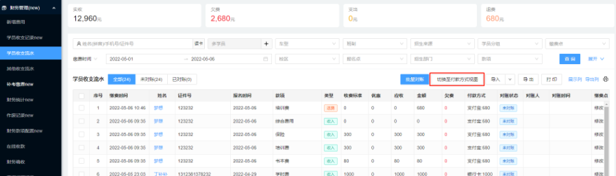 展示学员的收支流水明细,支持多条件筛选,导出,打印等,并且支持对账和切换视图,如图切换付款方式视图。