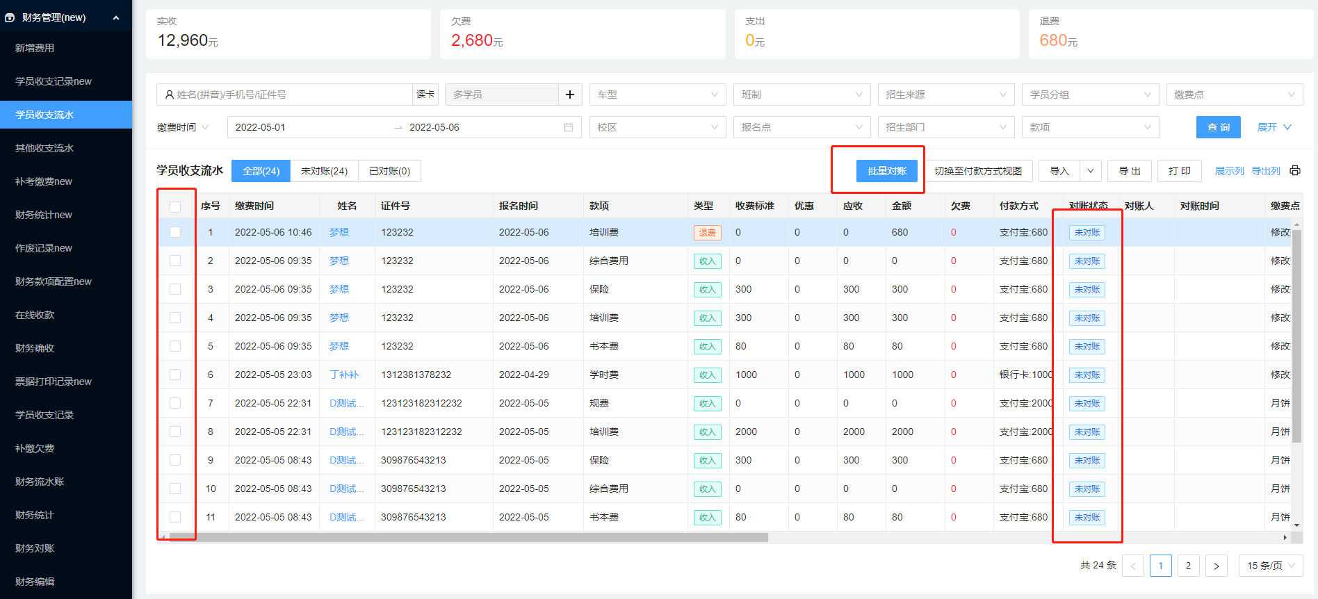 对账操作:勾选对应的明细项,然后批量对账,之后学员对账状态会从未对账变为已对账。