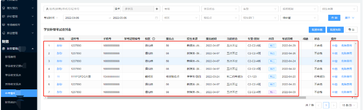 系统导入/手动修改的学员考试失败记录会展示在该页面,相关人员可以直接根据考试失败记录进行补缴考试费或者免除操作,如果出现该页面缺少学员考试不合格记录导致无法补缴补考费的,可以先在学员收支记录以及新增费用手动新增。也可以查看考试记录中的不合格记录是否存在,补充不合格记录的会正常显示。