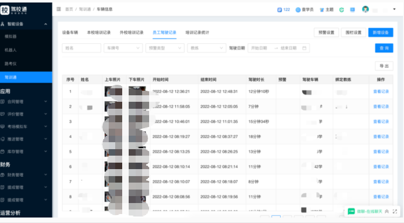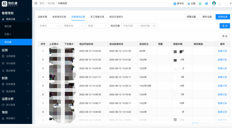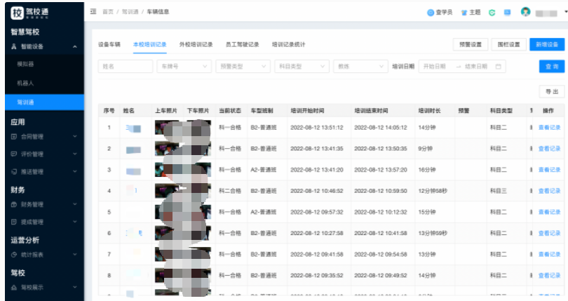 2、【本校培训记录】列表,驾训通车内摄像头,根据每分钟抓拍到主驾驶位照片进行人脸比对,如识别到是本校学员,则会生成本校培训记录(培训记录生成需满足连续5分钟抓拍到是同一学员)。记录中会展示学员上车照片、下车照片、开始时间、结束时间培训时长等信息;